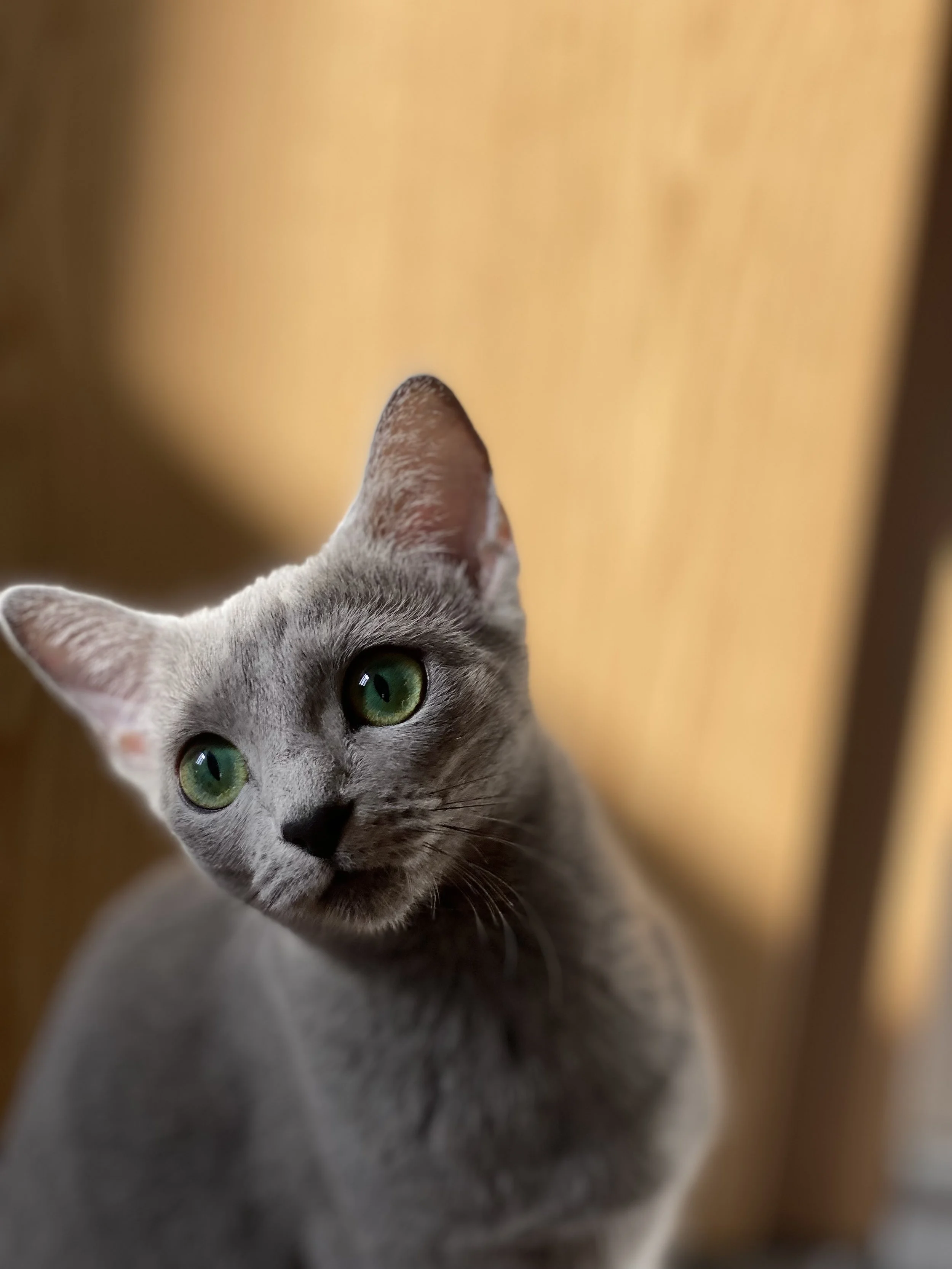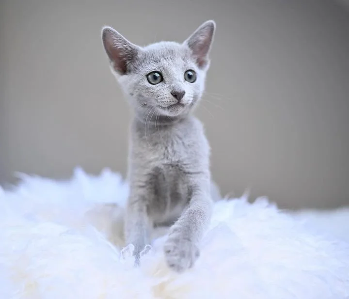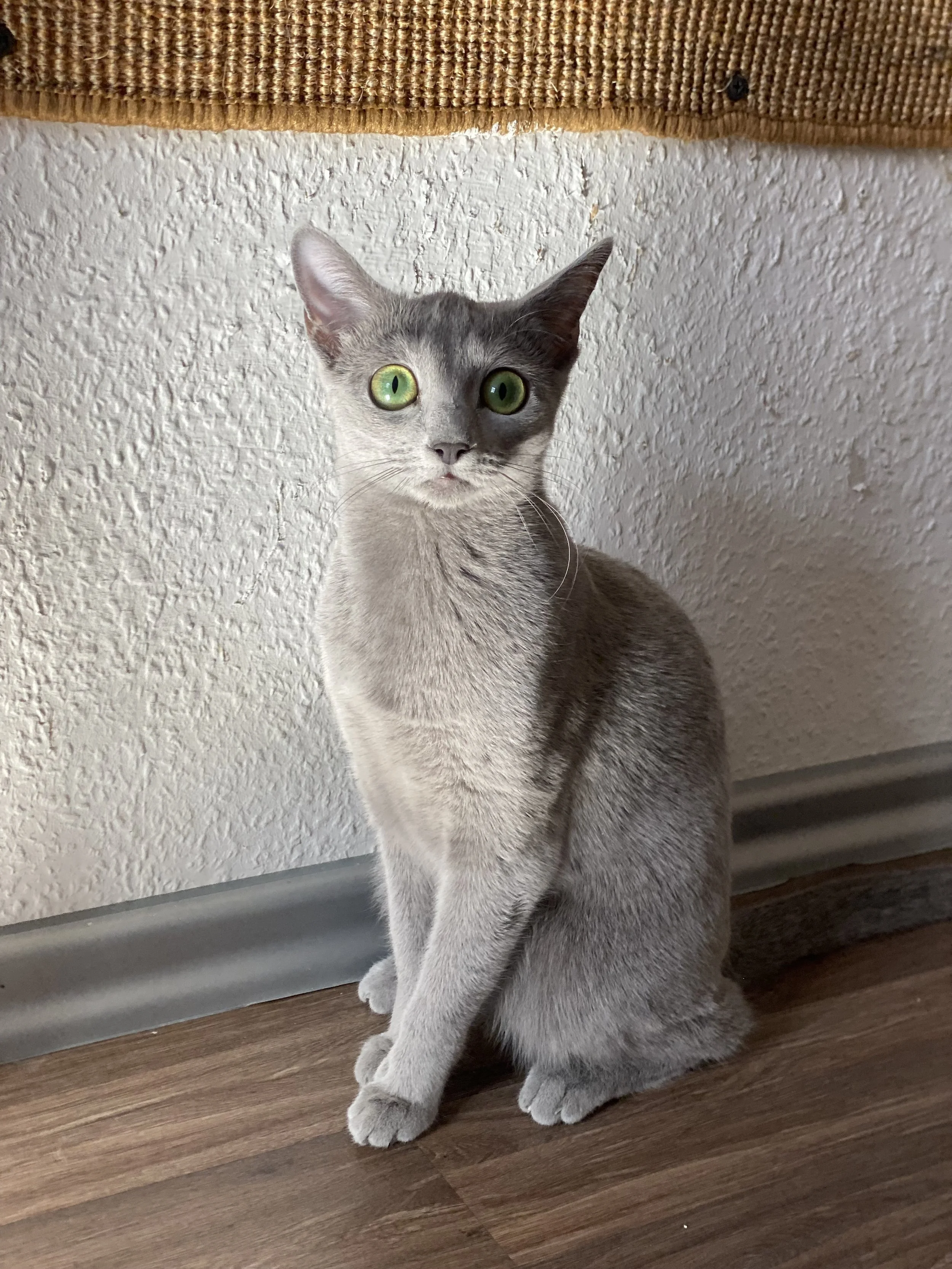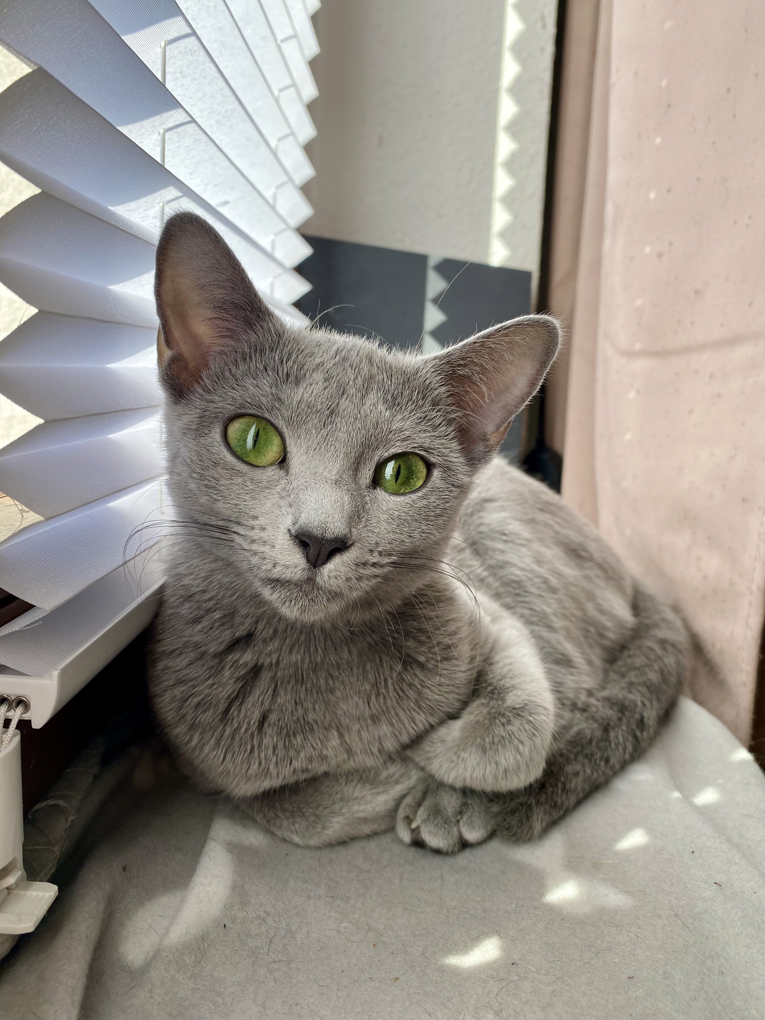 Unsere wundervolle Levana stammt aus einer außergewöhnlich liebevollen Zucht in Polen und hat mit ihrer Ankunft unser Zuhause im Sturm erobert. Schon auf den ersten Blick fällt ihr helles, silbrig schimmerndes Fell auf – außergewöhnlich hell selbst für eine Russisch Blau, was ihr eine beinahe ätherische Eleganz verleiht. Sie ist eine kleine, zarte Katze mit einer feinen, grazilen Figur und wiegt gerade einmal etwa zweieinhalb Kilo. Trotz ihrer zierlichen Erscheinung steckt in ihr eine faszinierende Mischung aus Intelligenz, Sanftmut und Lebensfreude.
