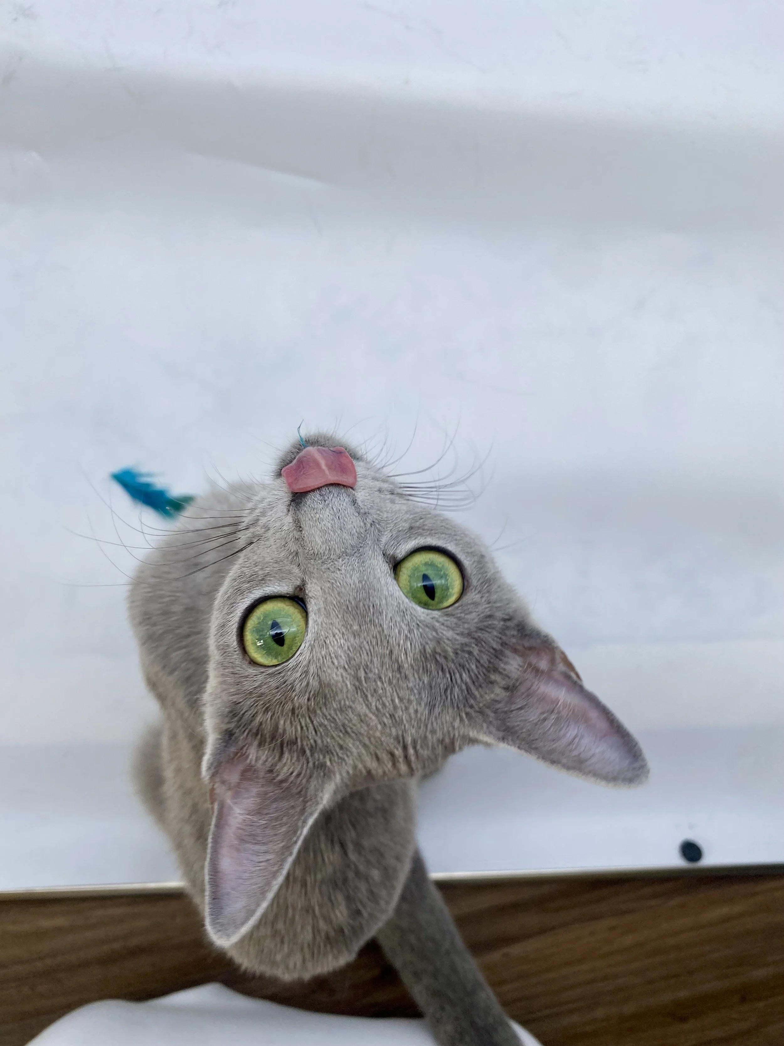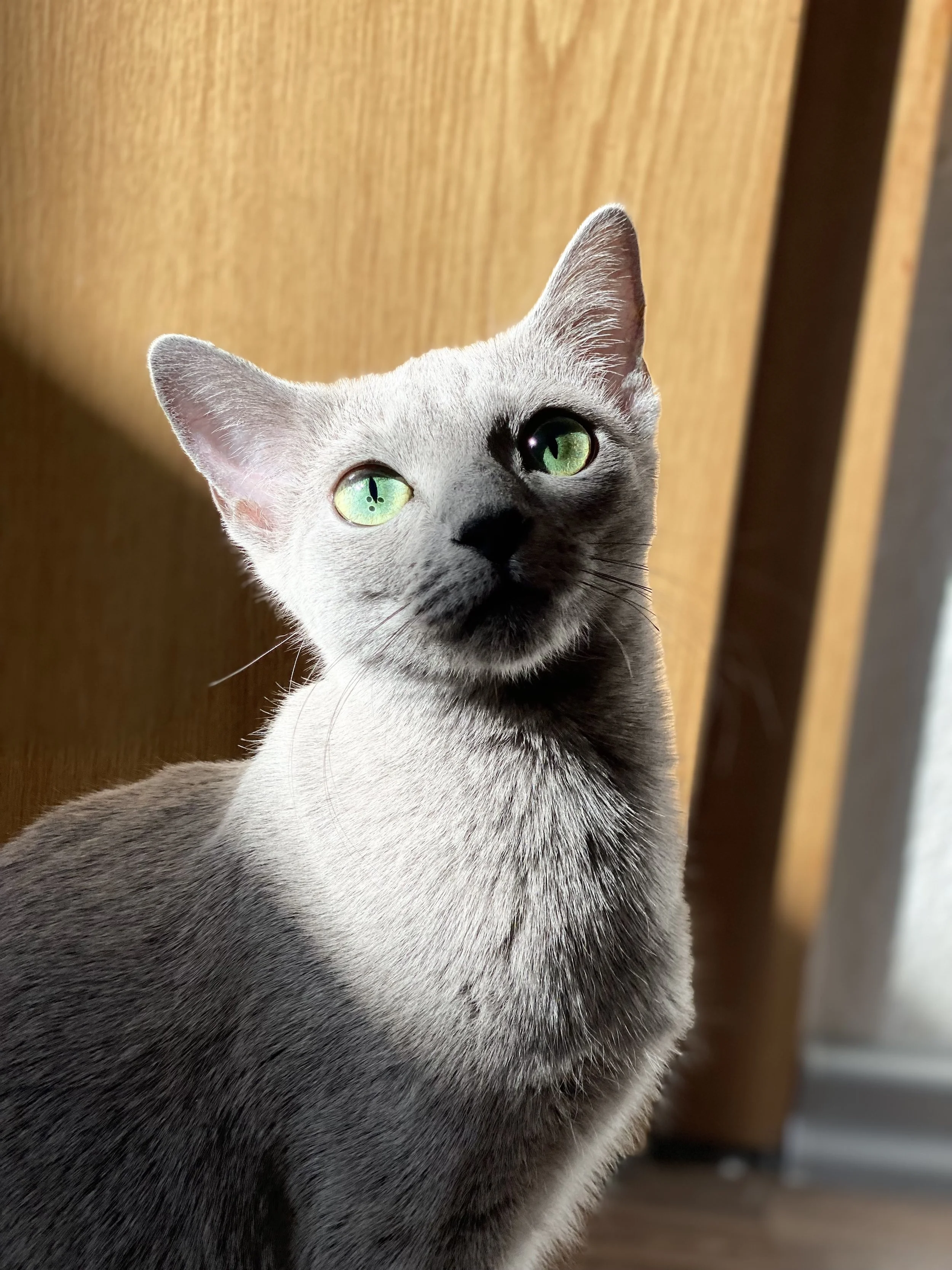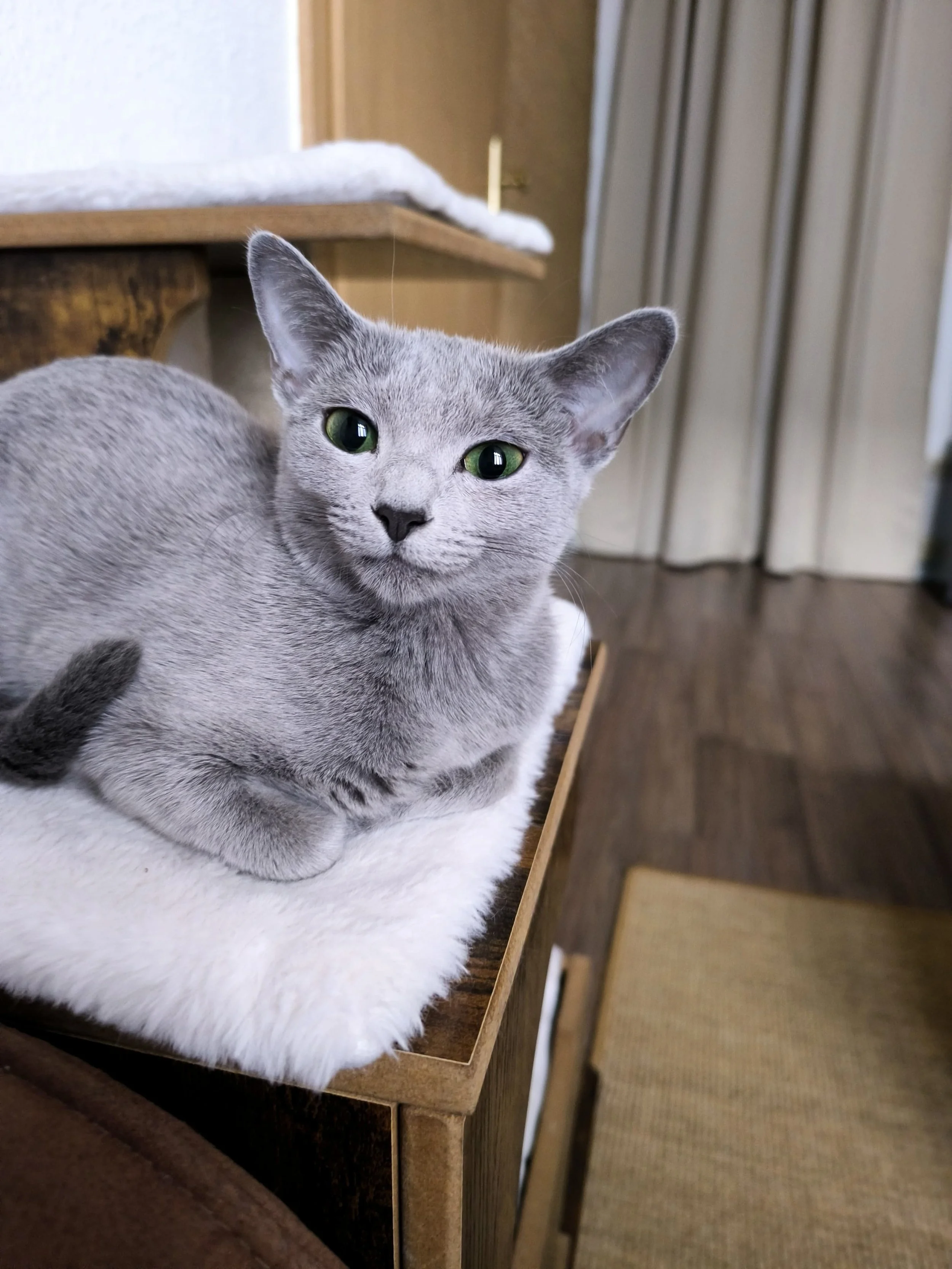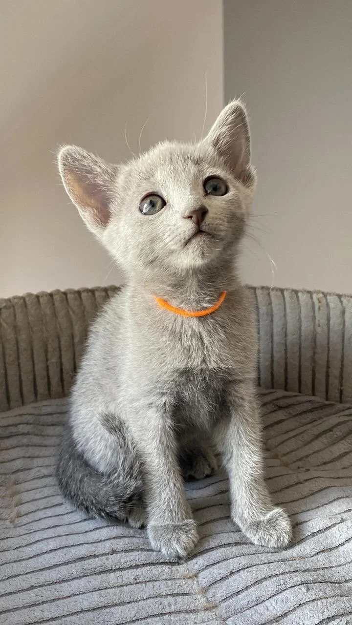 Unsere wundervolle Levana stammt aus einer außergewöhnlich liebevollen Zucht in Polen und hat mit ihrer Ankunft unser Zuhause im Sturm erobert. Schon auf den ersten Blick fällt ihr helles, silbrig schimmerndes Fell auf – außergewöhnlich hell selbst für eine Russisch Blau, was ihr eine beinahe ätherische Eleganz verleiht. Sie ist eine kleine, zarte Katze mit einer feinen, grazilen Figur und wiegt gerade einmal etwa zweieinhalb Kilo. Trotz ihrer zierlichen Erscheinung steckt in ihr eine faszinierende Mischung aus Intelligenz, Sanftmut und Lebensfreude.