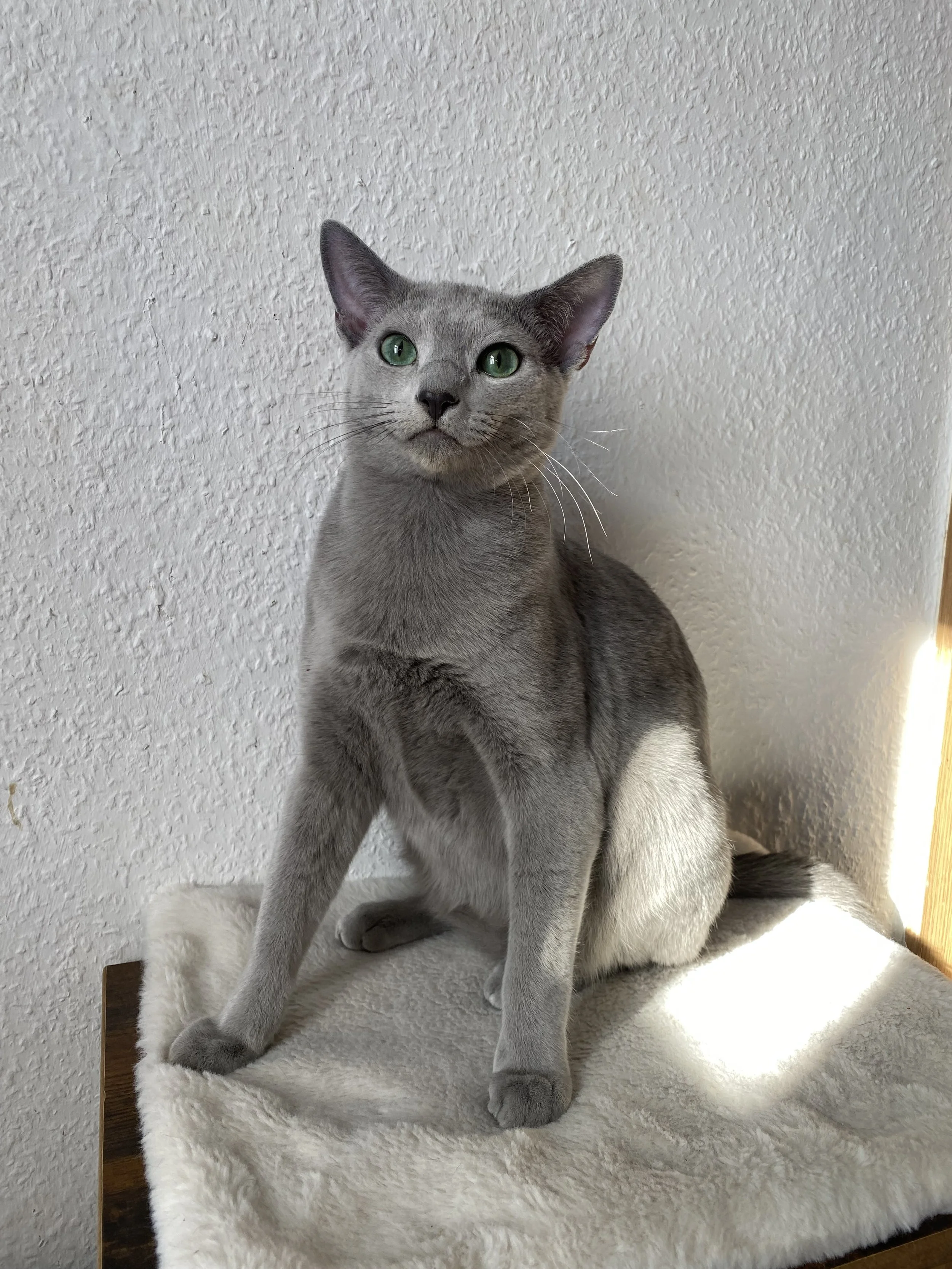 Geboren am 01. Juni 2024Unsere zarte Levana stammt aus einer wundervollen polnischen Zucht und ist ein wahres Juwel unter den Russisch-Blauen. Ihr helles, silbrig schimmerndes Fell und ihre grazile, feine Statur verleihen ihr eine fast elfenhafte Erscheinung – mit gerade einmal zweieinhalb Kilo ist sie klein, leicht und unglaublich anmutig.
